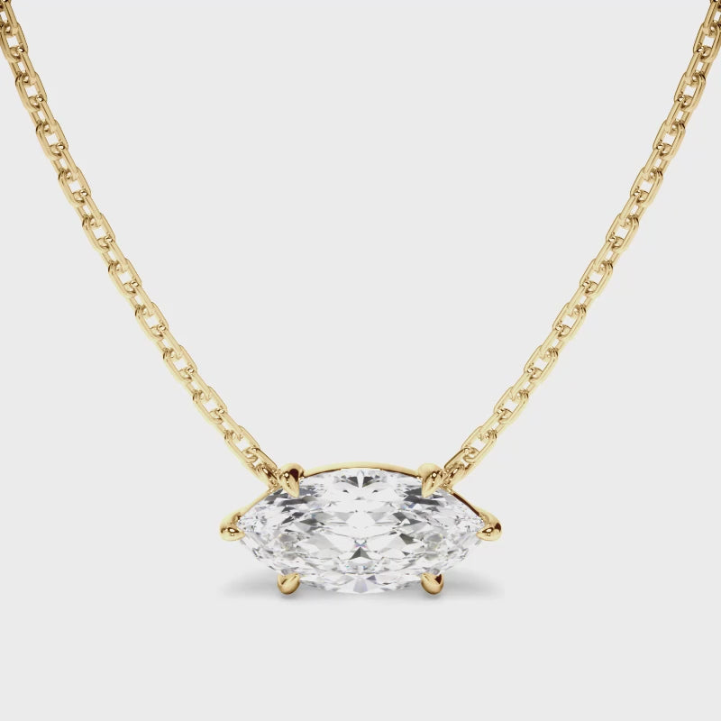 This elegant marquise cut diamond necklet, made with your choice of diamond centre stone, features an East West setting and includes a 45cm 18ct gold chain. Exuding fluidity in its line work, and boasting an elegant silhouette, as with all the pieces in our Bespoke Collection, this piece is made especially for you. Pictured here with a 1.50ct Marquise Cut Diamond, a final price is determined following your centre stone selection.